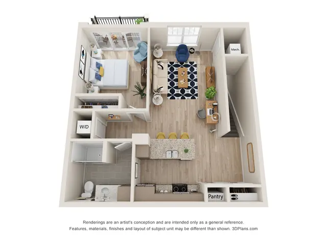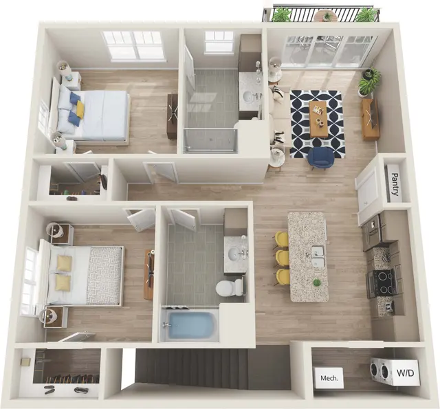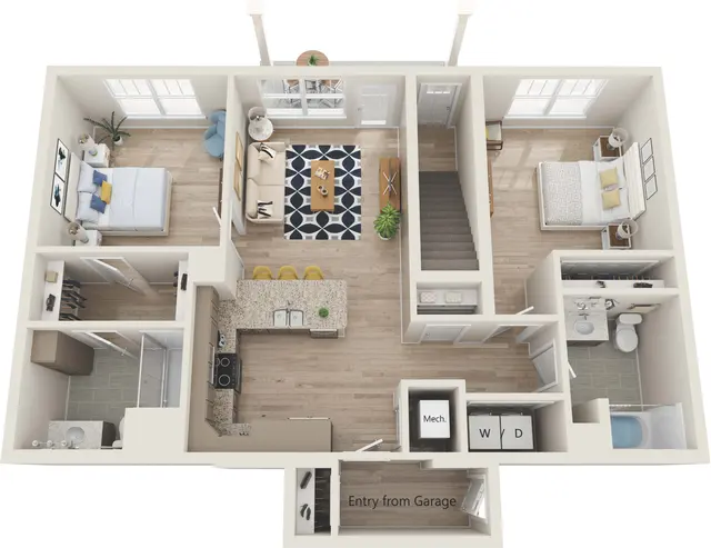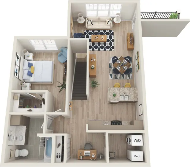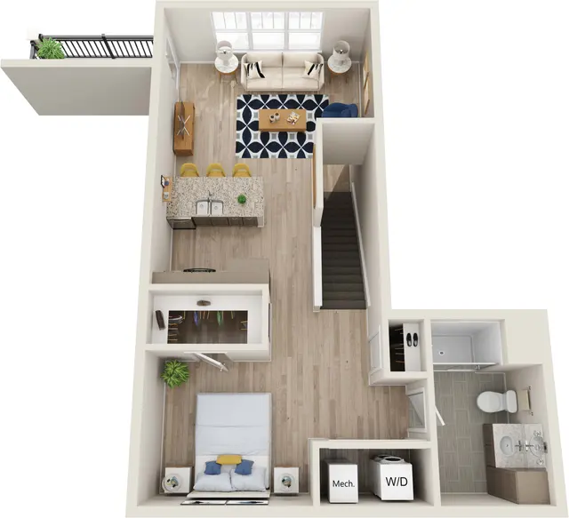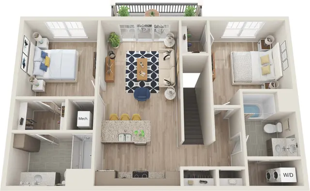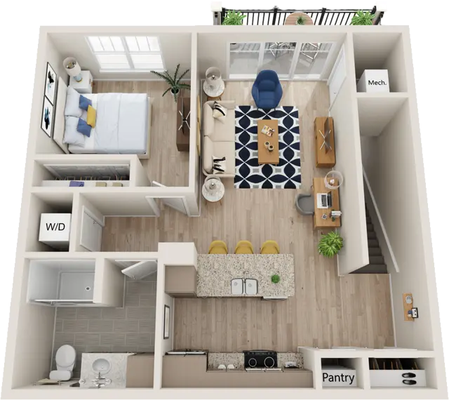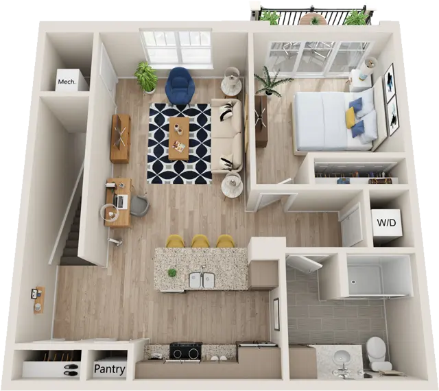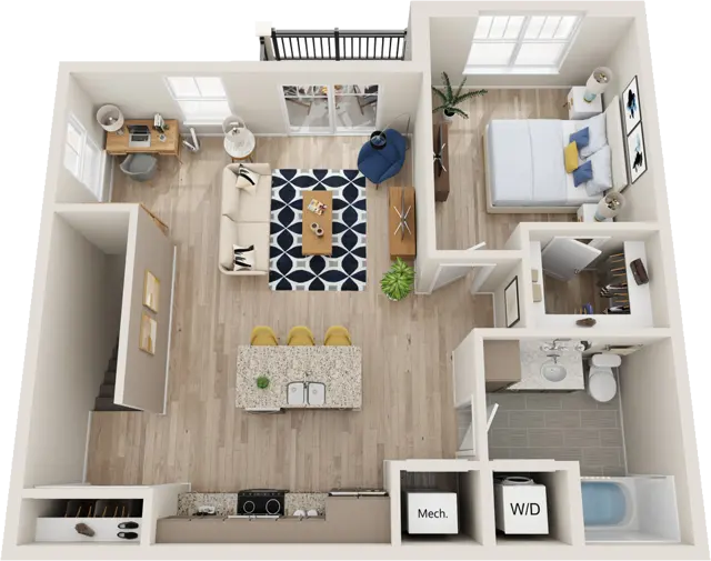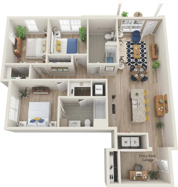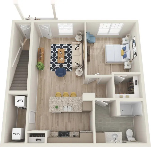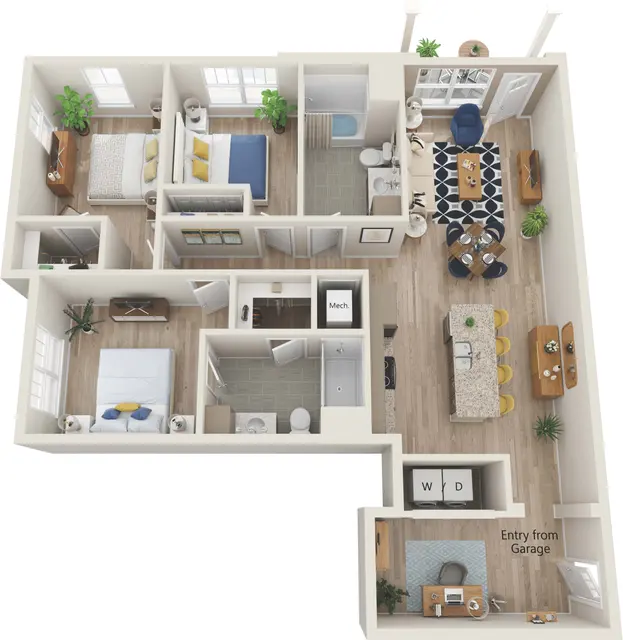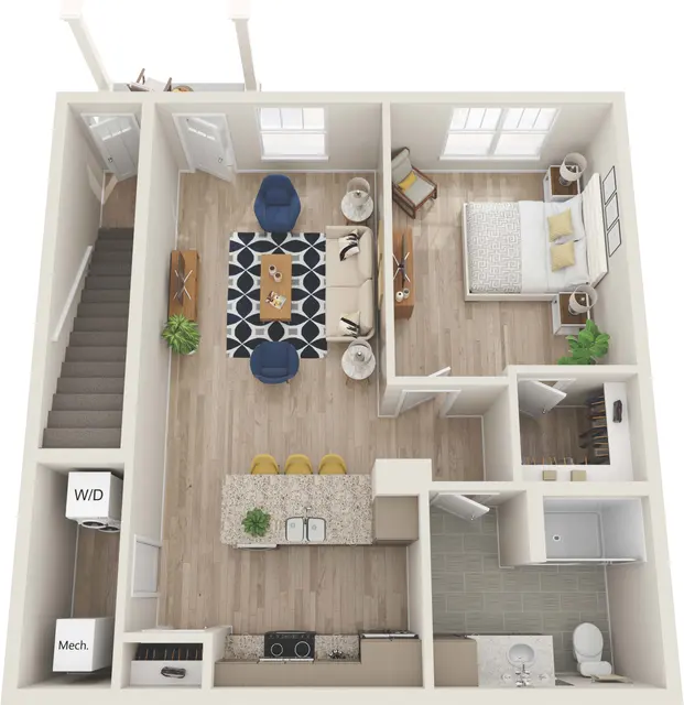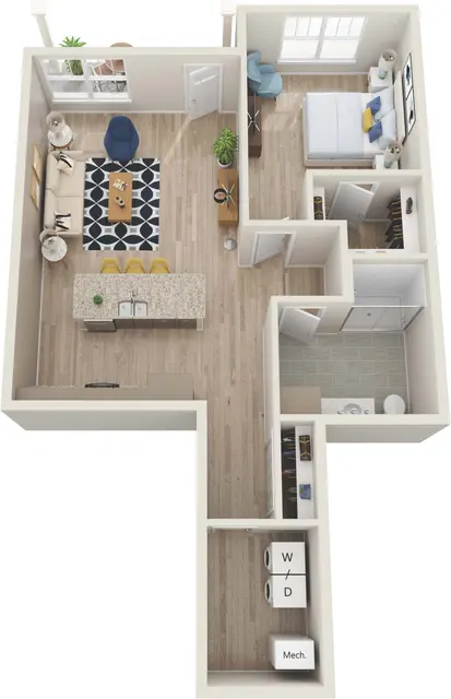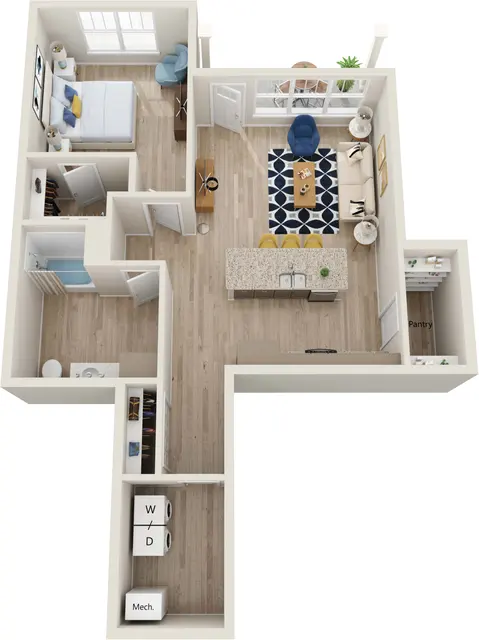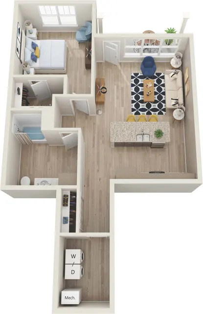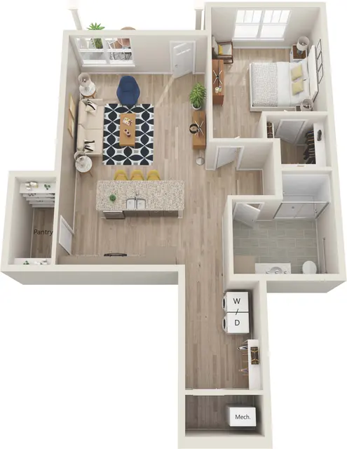 Choose from a variety of one-, two-, and three-bedroom floor plans designed for both functionality and flexibility. Each apartment home features a well-balanced design that supports comfort, flexibility, and ease of living.